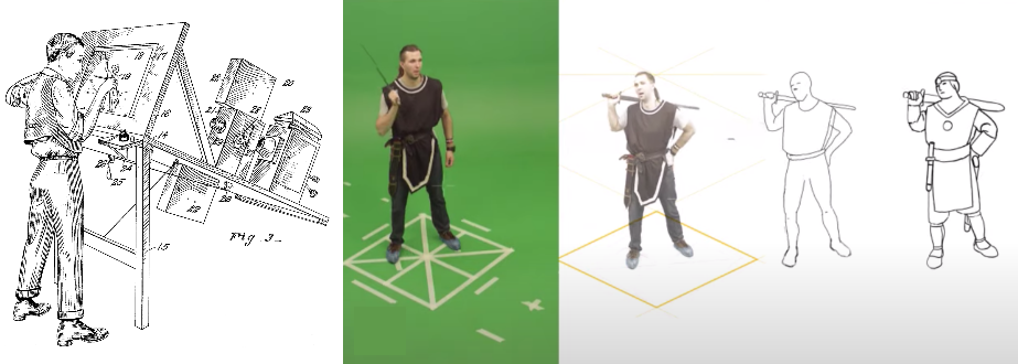 To the left is the original concept drawing for the Rotoscope Patent, and rest depict how a live actor is Rotoscoped
